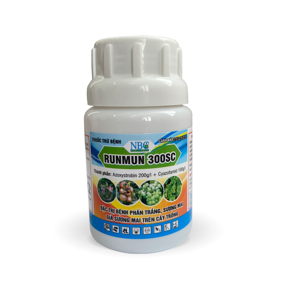 Runmun 300SC với phối hợp của 2 hoạt chất Azoxystrobin + Cyazofamid là loại thuốc đột phá nó có khả năng trừ nấm phổ rộng trên rau màu và nhiều loại cây trồng khác